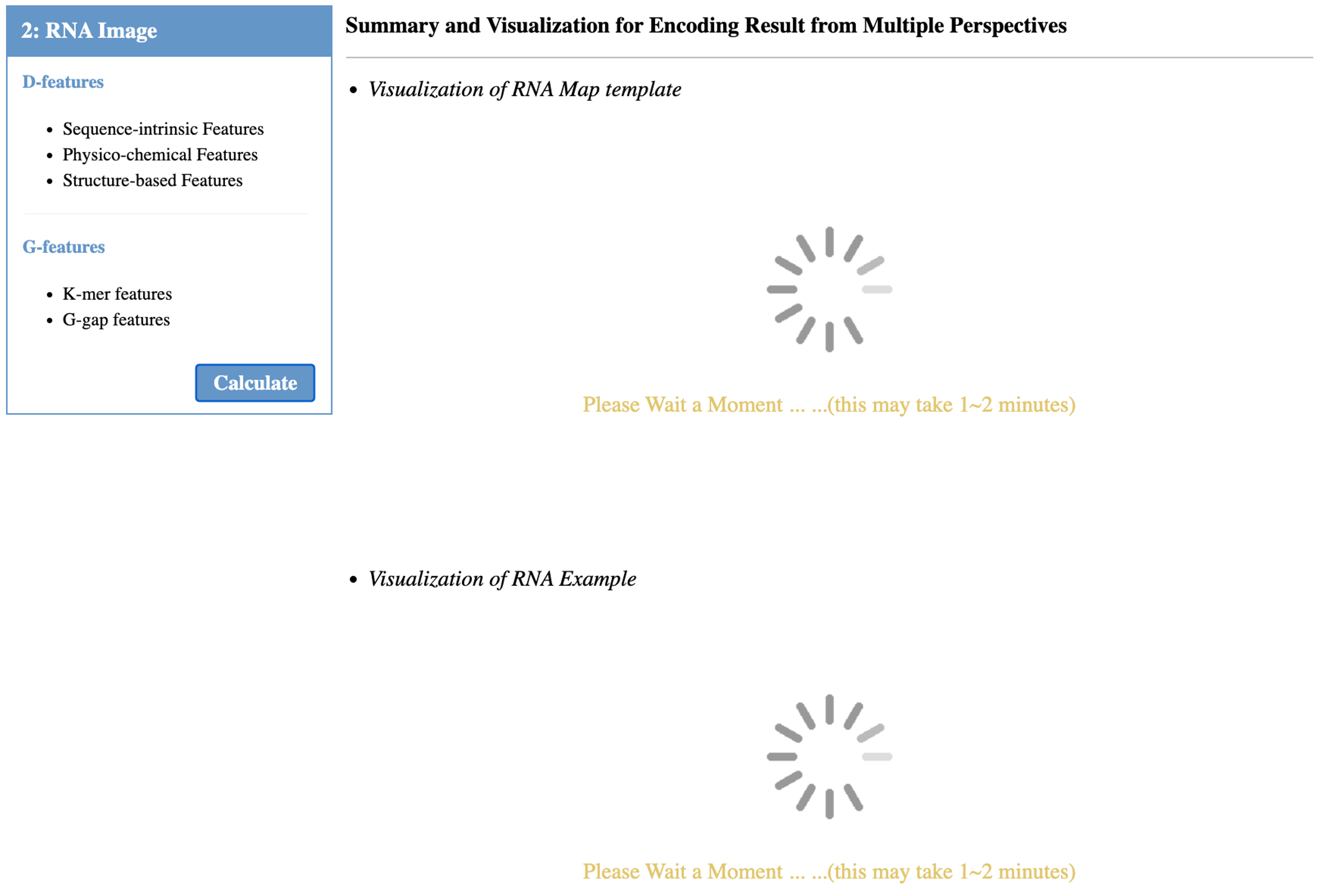 There are 2 encoding feature groups: D-features are divided into 3 categories (sequence-intrinsic features, physicochemical features and structure-based features) and G-features are divided into 2 categories (K-mer features and G-gap features), which are integrated into intRNA for RNA. The specific description of the feature are presented on the right side. Users can click 'Calculate' to encode RNA into RNAimage.
